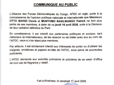 L'Alliance des Forces Démocratiques du Congo, parti membre de l'Union Sacrée de laNation, a